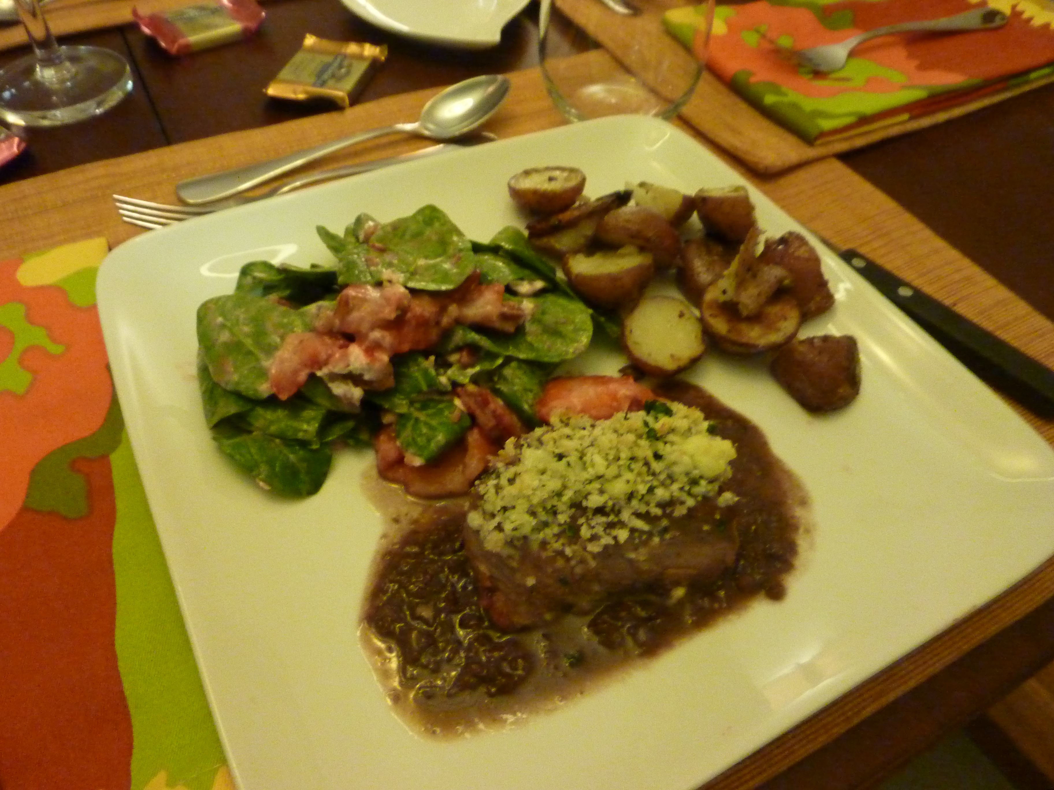 Dinner was one course and may be the best plate I have ever made! I served Blue Cheese Crusted Steak with Red Wine Sauce with Spinach Salad and Roasted New Potatoes. The Spinach Salad is my Mom’s secret weapon – strawberries, goat cheese and spiced pecans. One of my friends said that it may be the best salad she has ever had! The steak was incredible and although I wish the sauce was a prettier color, it worked great as a base for the steak – instead of my original plan to drizzle it on the plate.