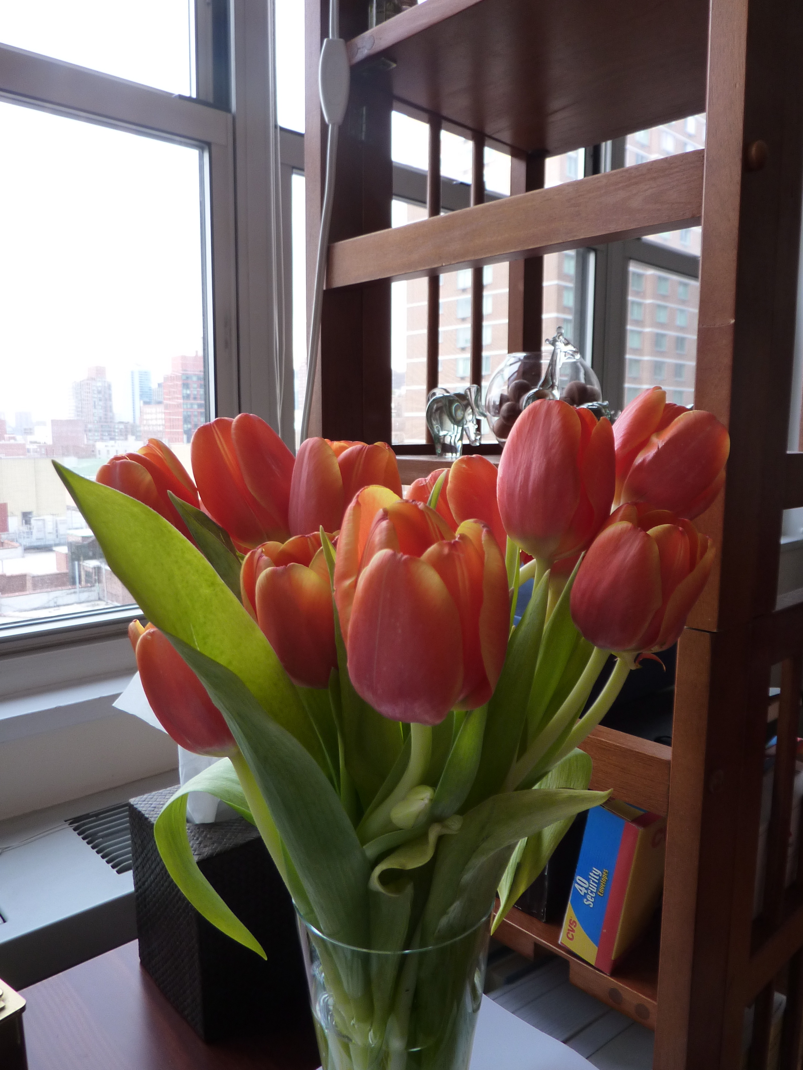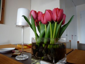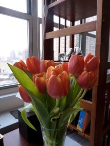 It was an amazing meal with incredible company! As if the joy of such a fun time wasn’t enough, my lovely friend Sarah brought a wonderful treat: tulips for the hostess! (On my bedside table below)