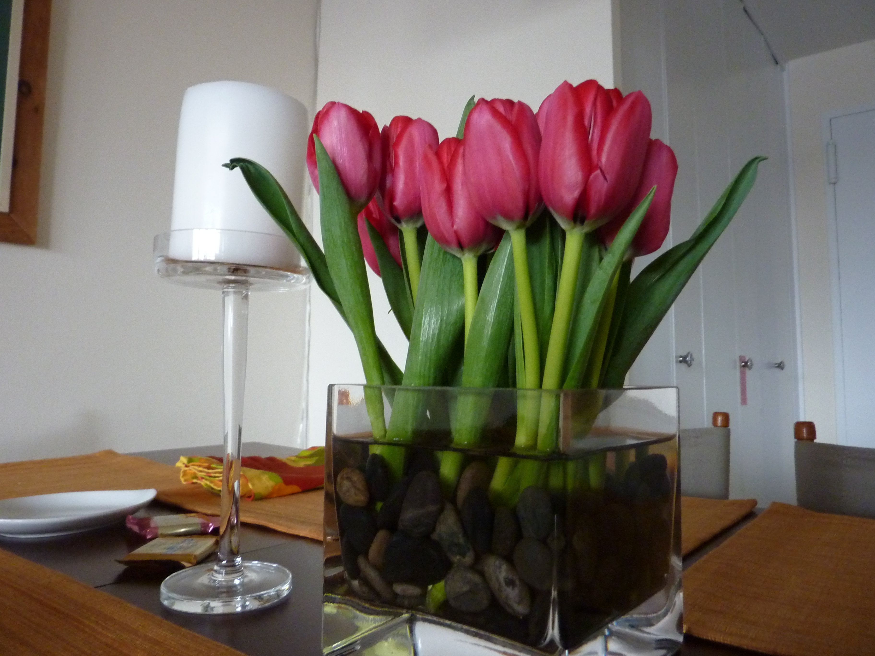 This simple centerpiece does a great job of elevating the entire atmosphere. In my opinion, both the square glass vase and river rocks are decorating essentials – I use both near constantly for dozens of uses. In this case all I did was trim down a grocery store bouquet of tulips (15 stems for $10!) and anchor them with the stones.