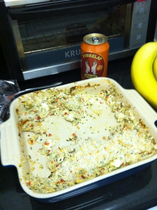 For my dinner, the left over dip went back into a 400 degree oven for about 10 minutes (until warm throughout) while I chopped some leftover red bell pepper and prepared a bed of arugula (about 2-3 cups). The Porkslap beer was left over from the Superbowl party and was poured into a glass, which can make all the difference.