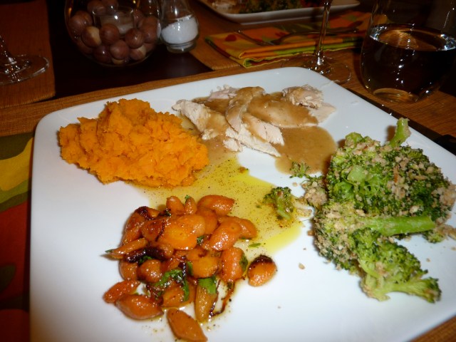 I roasted the chicken with lemon and herbes de provence. The gravy is made from the chicken drippings, white wine to deglaze, chicken broth, 2 Tbs diced shallots & 1 Tbs flour and is the best part of the dish! We were all (literally) pouring the gravy over our entire plates and eating it on everything! The roasted carrots with parsley & orange and steamed broccoli with lemon & pecan breadcrumbs were both made by the lovely Alex, who was a dream to share the kitchen with! Lastly, the mashed yams (which were not mashed enough if you ask me) is my favorite standby from Epicurious.