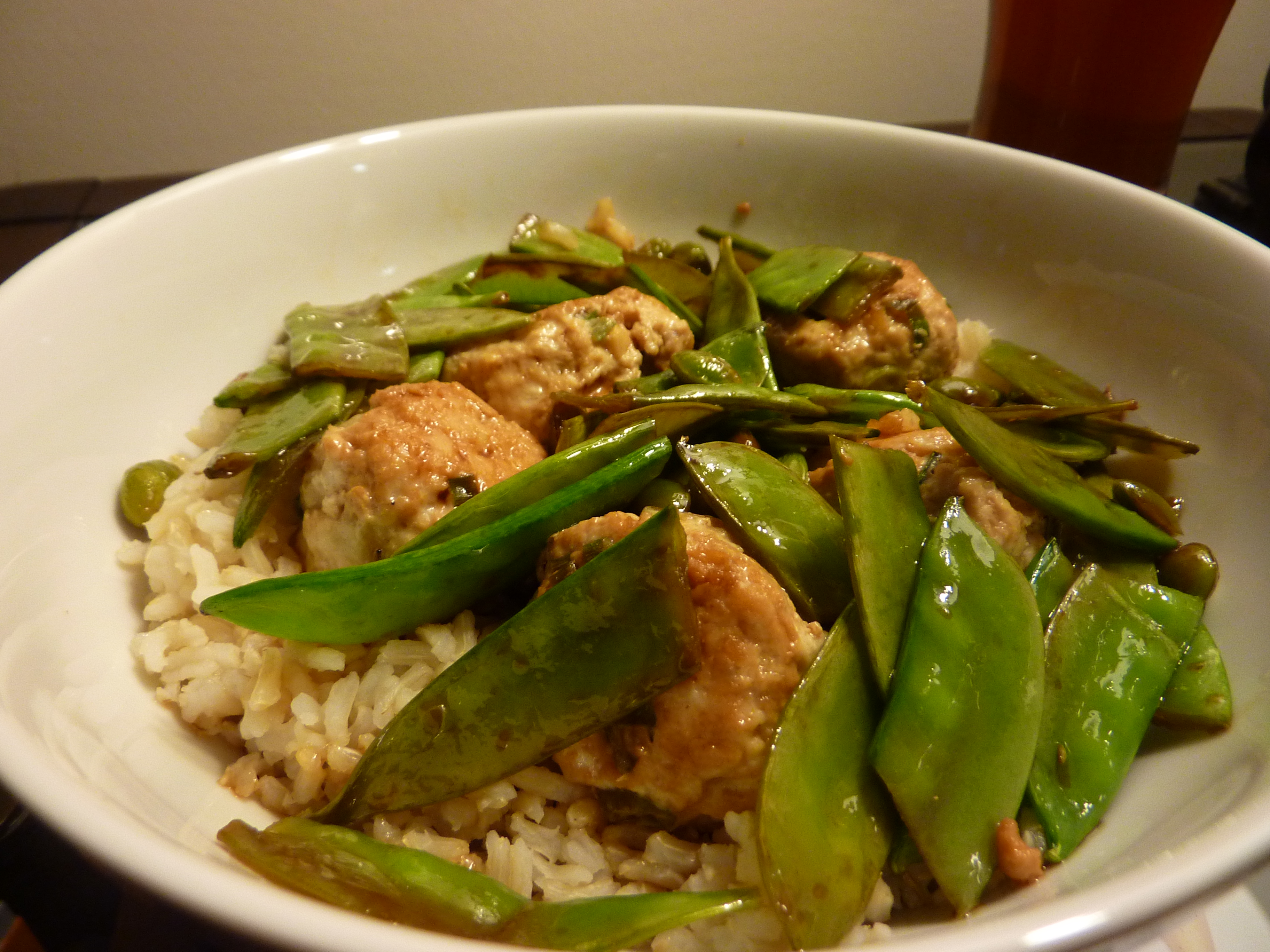 The only adaptations I made to the Real Simple recipe were to use long grain brown rice instead of white and to increase the amount of ginger and scallion in the meatballs. For 0.9lbs of chicken I used 3Tbs of diced ginger (not grated like they suggest) as well as 3 whole chopped scallions. I loved the flavor of the meatballs – ginger and soy may be one of my favorite combinations!