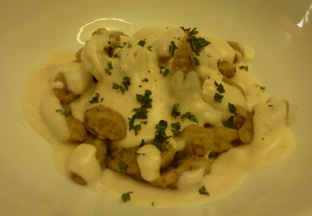 The second course looked back to the warming comfort foods of winter and was suggested by the lovely Nancy who found and recommended the Sweet Potato Gnocchi with Gouda Cheese Sauce recipe found on The Noshery. Although I originally intended on making the gnocchi myself as Nancy had done, when I realized I was trying to execute this dinner on a weeknight I relinquished and bought prepared Sweet Potato Gnocchi from The Amish Market for $3.98. New Yorkers are blessed to have high-quality freshly-made pastas very readily available, often at such a great price there is no reason to make your own!