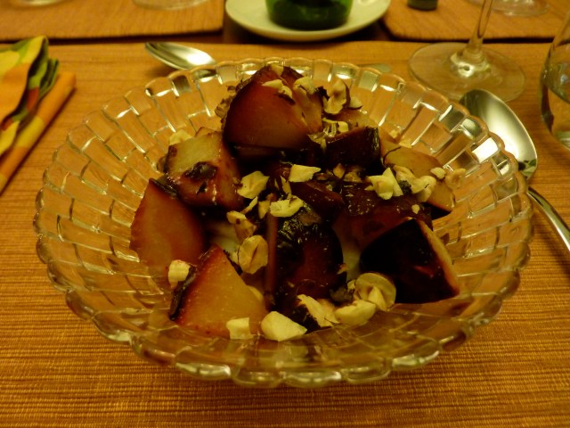 Lastly, we finished off the meal with my favorite non-indulgent dessert: Roasted Plums with Toasted Hazelnuts and Greek Yogurt. I love this dish becuase the flavor combination seriously tricks me in to thinking I’m eating something really rich! The plums are roasted in a small amount of butter and sugar and the final plate is drizzled with honey to keep the whole dish feeling sweet. Greek Yogurt serves as the perfect base (I use 2 Tbs Fage 0% at the bottom of each bowl) to give a creamy taste without melting like ice cream could. Finally the hazelnuts are what really keeps me coming back – something about their association with chocolate, the smell and taste of toasted hazelnuts just says “desert” in my mind, and taste buds!