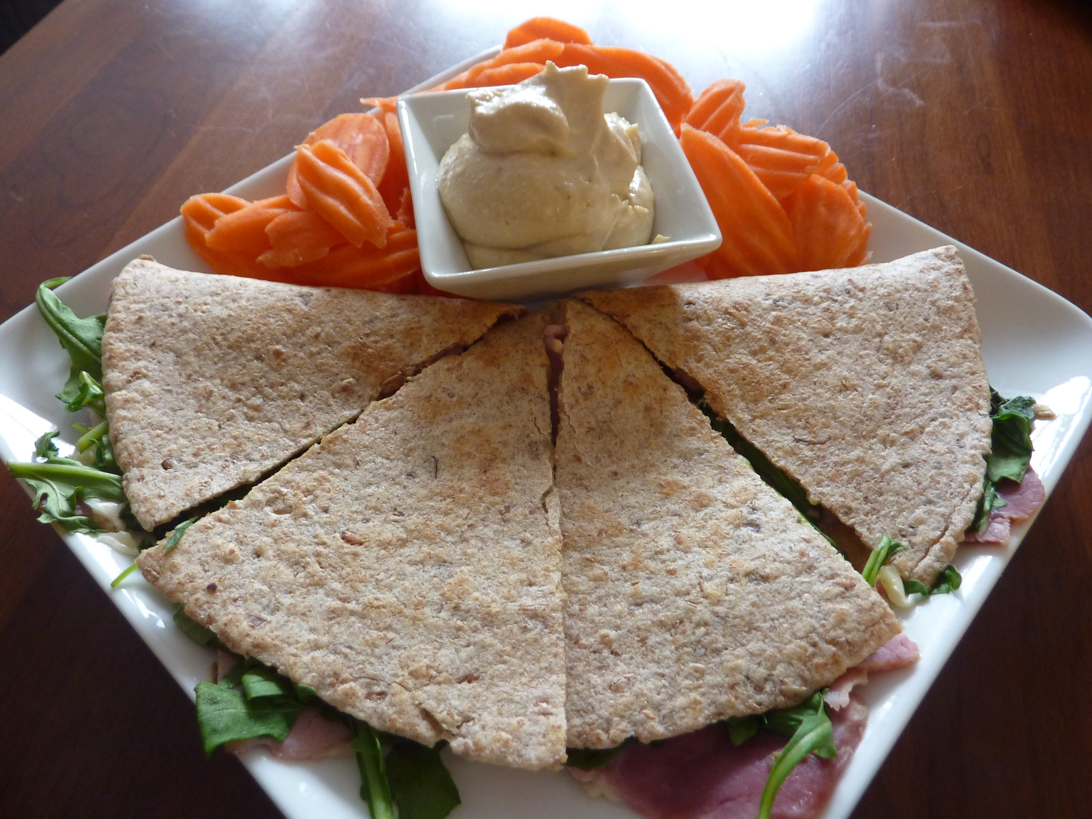 The “quesadilla” is nothing more than 1 multi-grain tortilla, rosemary ham, Swiss cheese, arugula and honey mustard warmed in a non-stick fry pan (no oil or butter needed). Served with a side of Sabra hummus and carrot chips it was a delightful step up!